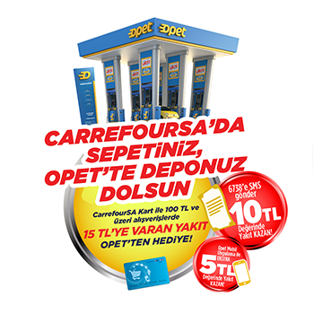 Bu kampanya 20 Ekim-20 Kasım 2017 tarihleri arasında, Türkiye’deki tüm CarrefourSA mağazalarında geçerlidir. Kampanyaya katılabilmek için CarrefourSA Kart ile tek seferde 100 TL ve üzeri alışveriş yapılması gerekmektedir. Bu koşulu sağlayan ilgili alışveriş fişlerinin altında kampanya katılım kodu çıkacaktır. Kampanyadan faydalanmak isteyen müşterilerin, CARREFOURSA yazıp bir boşluk bırakıp cep telefonu numaralarını, plakalarını ve katılım kodunu sırasıyla yazarak 6738’e SMS olarak göndermesi gerekmektedir. Başarılı SMS katılımı sonucunda, Opet tarafından 10 TL değerinde yakıt puan müşterilerin cep telefonu numarasına yüklenecektir. SMS ile başarılı kayıtlanan müşterilere, ilave 5 TL yakıt puan kazanabilmeleri için Opet mobil uygulamasında kullanabilecekleri ikinci bir katılım kodu gönderilecektir. Opet mobil uygulaması içinde bulunan CarrefourSA Kampanyası bölümündeki şifre giriş alanına kodu giren müşterilerin cep telefonlarına ilave 5 TL yakıt puan yüklenecektir. Puanlar Opet istasyonlarındaki market görevlisine cep telefonu numarası söylenerek, cepten tanıma uygulaması üzerinden harcanabilecektir. Puanların harcanabilmesi için cep telefonu aktivasyonunun yapılmış olması gerekmektedir. Kampanyaya SMS ve mobil kanaldan katılım için son gün 30 Kasım 2017’dir. Kazanılan yakıt puanlar kampanyaya dahil Opet istasyonlarından tek seferde yapılacak 100 TL ve üzeri benzin veya motorin alışverişlerinde, 15 Aralık 2017 tarihine kadar harcanabilir olacaktır. Harcanmayan puanlar 16 Aralık 2017 tarihinde silinecektir. Bir müşteri kampanyadan en fazla 15 TL yakıt puan kazanabilecektir. Kampanya sınırlı sayıdadır ve başka bir kampanya ile birleştirilemez. Kampanyaya 18 yaşından büyükler katılabilir. Alkollü içecekler, tütün mamulleri, GSM TL yükleme harcamaları ve kuyum alışverişleri; kampanya kapsamında olmadığından, alışveriş tutarı hesaplanırken dikkate alınmayacaktır. CarrefourSA ve Opet kampanyayı durdurma, sona erdirme ve kampanya kapsamında değişiklik yapma hakkını saklı tutar. Detaylı bilgi opet.com.tr ve 444 10 00’da.